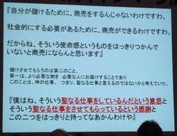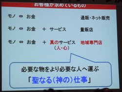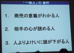 さらに、商売の意義を「聖なる仕事」としたという。「必要なものを必要な人に届ける、これは神の仕事である」。そして「商売は人のため、人に喜んでもらうため」。こうした聖なる仕事である商売に携わる時、1.商売の意義がわかる人 2.相手の心が読める人 3.人よりよけいに頭が下がる人が「一商人」であり、幸之助氏は全社員に「(松下電器が将来如何に大をなすとも)常に一商人なりとの観念を忘れず」と説いた。