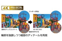 また、独自の画像解析により映像の細部や輪郭部の精細感を高める「4K ハイディテールコンバーター」に対応。映像のノイズ除去やスケーリング時に発生するジャギーをスムーズ化することで、ディテールにこだわった映像を実現したという。