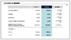 2019年度第3四半期の連結売上高は、前年同期から3%増の2兆4,632億円、営業利益は同769億円減の3,001億円、四半期純利益は同1,994億円減の2,295億円。また、EMI連結子会社化に伴う再評価益(音楽分野+1,169億円)など一時的な要因を除外した調整後の数字は、営業利益が前年同期比165億円増の2,765億円、四半期純利益が同583億円増の2,162億円となる。