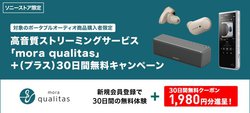 ソニーは、直販サイトのソニーストアで対象のポータブルオーディオ商品を購入すると、ハイレゾストリーミングサービス「mora qualitas」を通常よりも30日多い60日間無料体験できるキャンペーンを開始した。