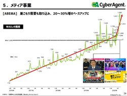 オンデマンド強化の配信の下に「Abema TV」から「ABEMA」へと名称変更した動画配信サービス、ブログサービス「Ameba」、「アベマショッピング」などをセグメントに含むメディア事業は、「ABEMA」が増収を牽引し売上高が前年比18.8%増となる138億円を達成。営業損益では依然として赤字は続いているものの、損失額が第1四半期の50億円から42億円へと改善した。