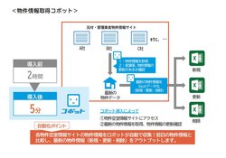 「不動産コボットfor 物件取得」では、コボットがブラウザを立ち上げ、物件空室情報サイトへ自動でログインし、新規物件情報や前日までに申し込みがあり削除された物件情報、その他更新情報を取得。取得したデータと既存のデータの差異を自動で確認し、新規物件リスト、削除物件、更新情報をエクセルなど任意のデータ形式で自動入力する。これにより、導入前に約2時間を要していた1人あたり1日の作業時間が、導入後には約5分に削減された実績が報告されている。
