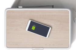 上部に木目調のトップテーブルを採用することで、「オーディオを超えた価値や 楽しみを届ける」とするデスクトップオーディオシステム。ワイヤレス充電規格Qiに対応し、スマートフォンなどの対応機器を充電することができる。