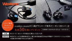 テックウインドは、同社が取り扱うWestoneのイヤホン“Wシリーズ/Bシリーズ”購入者の先着50名に、e-onkyo musicで使える「1曲ダウンロード無料クーポン」3枚セットをプレゼントする「ハイレゾ音源プレゼントキャンペーン」を5月15日より実施する。