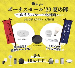 プラススタイルは、同社のスマートホーム商品を中心とした15商品を最大40%オフで販売する「+Style ボーナスセール '20夏の陣 〜おうちスマート化計画〜」を、2020年6月9日から15日にかけて開催する。