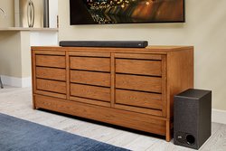 サウンドバー本体に25mmトゥイーター×2と32×112mmフルレンジ×2、ワイヤレスサブウーファーに134mm×1のスピーカーユニットを搭載。サウンドバー部はテレビ画面や受光部を遮らない高さ55mmのスリムデザインとなっており、別売りのフックと組み合わせることで壁掛けにも対応する。