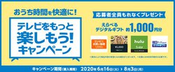ソニーは、対象製品を購入して応募すると全員にコンビニお買い物券/Uber Eatsギフトチケット/Huluチケット/図書カードネットギフトのいずれか1,000円分をプレゼントする「テレビをもっと楽しもう!キャンペーン」を開始した。