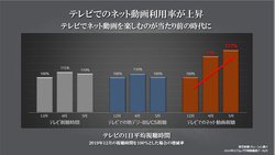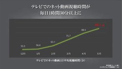 加えて、テレビでのネット動画利用率が急激に伸びているという同社の調査結果も紹介。2019年12月を基準に考えた場合に、2020年5月のテレビでの地デジ/BS/CS視聴時間はほぼ横ばいであるのに対し、ネット動画視聴は177パーセントに伸び、毎日1時間30分以上がテレビでのネット動画視聴に費やされているのだという。