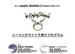 初代モデル「popIn Aladdin」の下取りで2万5千円引き、他社製シーリングライトの下取りで1万円引きとなる。他社製シーリングライトはメーカーや機種を問わずすべて対象となるという。詳しい概要はキャンペーンページにて確認されたい。