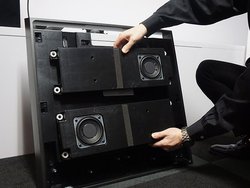なお、77型のこの大容量バスレフ型重低音バズーカ内蔵スタンドは取り外しが可能。有線接続という制約はつくが、テレビ本体を壁掛け設置した際には別置きで利用することができる。