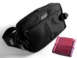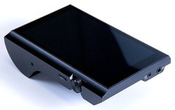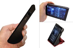 筐体はバッテリーハウス部分が大きく張り出したデザインで、縦向き/横向きどちらでも高いホールド性を発揮。付属の革製スタンドにより、縦置きも容易となっている。また、パッケージを簡素とする代わりに、本製品とセットで使用することを考慮したウエストバッグも同梱する。