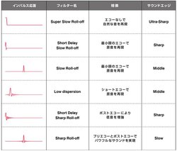 今回のアップデートにより、DACフィルターの選択オプションが追加。「Super Slow Roll-off」「Short Delay Slow Roll-off」「Slow Roll-off」「Low dispersion」「Short Delay Sharp Roll-off」「Sharp Roll-off」の6種類のDACフィルターを選択可能となる。なお本フィルターはPCM 192kHz/24bitまでの適用となり、DSD/MQAフォーマットには適用されない。