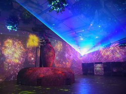 同館の目玉である、空間の広大な壁面や床にプロジェクションマッピングを駆使して繰り広げられる約7分間のエンターテインメント「花とデジタルのアートショー」を体験した。プロジェクションマッピングをサポートするのは、エプソンの映像空間演出向けプロジェクターで、レーザー光源搭載の高輝度モデルEB-L1070U 11台とEB-L610W 9台。イマーシブオーディオによる立体音響も相まって、迫力と臨場感に溢れた演出となっている。