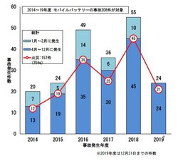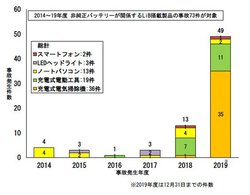2014年度から2019年度の6年間、NITE(ナイト)に通知があっただけでも、リチウムイオンバッテリーを搭載した製品の事故は合計982件に及ぶ。製品別では、モバイルバッテリー、ノートパソコン、スマートフォンの事故が多くを占めているが、2018年度から2019年度にかけては、充電式の電気掃除機や電動工具の事故が急増。事故の多くは、事業者の指定する純正バッテリーではなく非純正バッテリーで発生した火災事故だ。