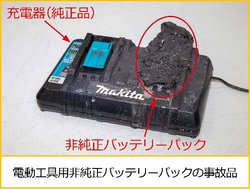 【原因】非純正バッテリーのバッテリーパック内部でショートして異常発熱し、焼損したものと考えられる。