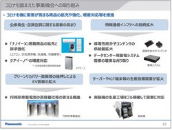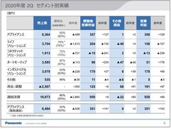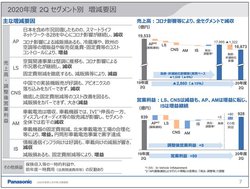 セグメント別では、アプライアンスやオートモーティブが改善。アプライアンスでは、コロナ影響による減販損があるものの、巣篭もり需要による調理家電や冷蔵庫、清潔志向による洗濯機や空調関連商品に対する増販益や、販促費・固定費などのコントロールで増益となった。オートモーティブでは、車載電池が増収。北米車載電池工場の合理化等により増益となり、円筒形車載電池事業で黒字達成となった。
