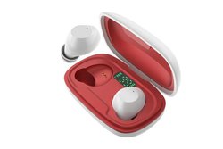 ゲオ限定で販売する完全ワイヤレスイヤホン。充電ケースにデジタルディスプレイを搭載していることが一つの特徴で、これによりバッテリー残量が簡単に確認できると紹介している。