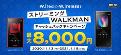 「W.ired or W.ireless? ストリーミングWALKMANキャッシュバックキャンペーン」は、期間中にウォークマン“NW-ZX500シリーズ”を購入・応募すると8,000円、“NW-A100シリーズ”を購入・応募すると3,000円のキャッシュバックが受けられるというもの。なお、「NW-A100TPS」は対象外となる。