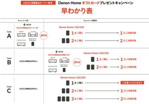 期間中、下記の「HEOS」搭載製品を所有している方が、ネットワークスピーカー「DENON HOME 250」もしくは「DENON HOME 150」を購入することで応募可能。DENON HOME 250購入で5,000円分、DENON HOME 150購入で3,000円分のVプリカギフトコードがプレゼントされる。
