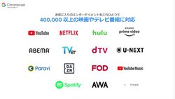 これまでのChromecastと同じように、テレビのHDMI端子に接続するだけで利用可能。対応サービスはYouTubeやNetflixのほか、hulu、Amazon Prime Video、ABEMA、TVer、dTV、U-NEXTなど。40万以上の映画や番組に対応しているという。