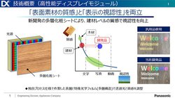 そして、今回の発表にあわせて開催したオンライン説明会では、前述のように “次世代ディスプレイ” についても紹介。新開発の多層化粧シートを用いた「高性能ディスプレイモジュール」と、映り込みの無いクリアな映像を実現したという「ミラーディスプレイ」について説明した。