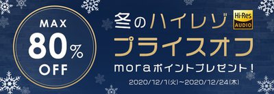 音楽ダウンロードサービスmoraは、約1,400タイトルを対象に最大80%オフとなる「冬のハイレゾプライスオフキャンペーン2020」を開催。期間は本日12月1日から24日23:59まで。