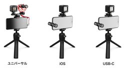 「ブイロガーキット」はスマートフォンのタイプに合わせて3種類を用意。マイク端子が3.5mmTRRS端子対応の「ユニバーサル」、Lightning端子対応の「iOSエディション」、USB-C対応の「USB-Cエディション」をラインナップする。