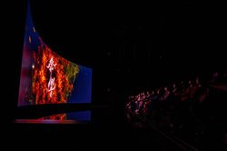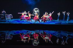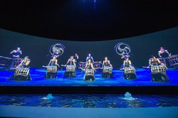 このライブビューイングは、昨年12月に大分県iichicoグランシアタで開催されたDRUM TAOツアーファイナルのライブパフォーマンスを、横12m×縦3mという超巨大スクリーンで8Kクオリティで観賞できるというもの。録画したステージをたんに再生するだけではなく、スクリーンの下に特設の「水」ステージを建設。和太鼓のリズムに合わせて波紋が動いたり、噴水ショウが行われるなど、シルク・ド・ソレイユの『オー』を思わせるような舞台装置が展開される。