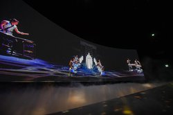スクリーンへの投影には、パナソニックのPT-RQ32KJという業務用のレーザープロジェクターを2台使用。ステージ全景、寄り、真上など、4台のカメラで撮影した公演の模様を、このイベントのために特別に編集。DRUM TAOのステージの魅力は、ダイナミックな和太鼓の演奏に加えて、ステージ上を縦横無尽に動き回るダンスパフォーマンスにもある。殺陣やフラッグパフォーマンスといった小道具も効果的に使いながら、ミュージカルさながらの多幸感あるステージを繰り広げる。