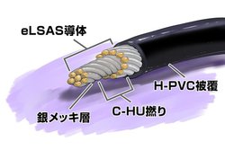 高純度銅と銀を配合した独自導体「eLSAS(エルサス)」を採用するケーブル。導体にはSAP(Soft Anneal Peeling)処理を行なった上から銀メッキを厚く施しており、歪曲耐性の高さと優れた周波数特性を両立したという。また、導体の中央部と外周部で素線の撚り密度が異なる独自の「C-HU撚り構造」採用により、取り回しと耐久性を向上させたとのこと。