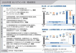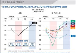 全社では、コロナ影響により1Qがボトムとなったが、その後回復傾向が続いて3Qでは前年を上回った。なおコロナによる減収影響は、1Qの3,500億円から3Qに500億円となり、マイナス影響が回復した結果となった。セグメント別の推移では、オートモーティブ、インダストリアルソリューションズ、アプライアンスは、3Qに前年を上回る水準に回復した。