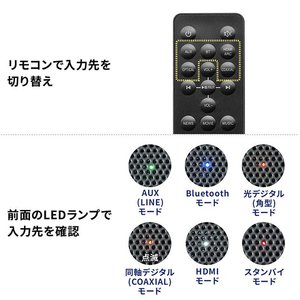 「NEWS」「MOVIE」「MUSIC」の3つのサウンドモードを備えており、付属のリモコンから切り替え可能。接続はHDMI(ARC)、同軸デジタル、光デジタル(角型)、AUX(3.5mmステレオミニ)、Bluetoothに対応する。