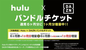 DAZN(ダゾーン)とHulu(フールー)は、両サービスを通常料金よりもお得に視聴できる「Hulu x DAZNバンドルチケット」を本日3月22日(月)より発売した。価格は15,781円(以下、価格はすべて税込)で、両サービスを7ヶ月視聴可能。通常料金(20,657円)よりも1ヶ月分安く視聴できる計算になる。