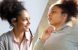 Bluetoothで接続する骨伝導タイプのイヤホン。耳の穴をふさがないため、周囲の音や会話も聞こえて安全に使用できること、閉塞感がなく耳が痛くならずに長時間の通話やウェブ会議で使用できることを特徴としてアピールしている。