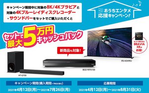 また、3点セット購入の場合は、同時に応募手続きする必要がある。なお、一度8K/4Kブラビアと4K BDレコーダーまたはサウンドバーの2点セットで応募したのち、期間中に3点目に該当する4K BDレコーダーまたはサウンドバーを購入して追加で応募したい場合には、7月27日以降に改めて3点セットで応募する必要があり、追加のキャッシュバック分は別途振り込みで対応となるとのこと。