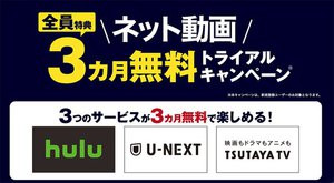 さらに、各サービスそれぞれ抽選で100名に追加プレゼントも。「Hulu」では1年分のHuluチケットを、「U-NEXT」と「TSUTAYA TV」では各サービスで利用できる10,000ポイントが付与される。