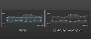 また、映像ソースのコマごとのメタデータに従い映像を最適化する「ダイナミックトーンマッピング」にも対応。映像全体を通して均一な従来のトーンマッピング(Static Tone Mapping)とは異なり、フレームごと変化させることで、常に適した明るさ、色彩を表現することができるとしている。