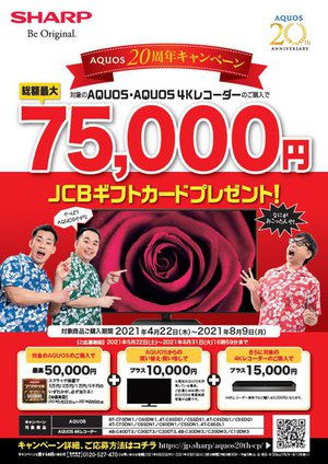 シャープは、同社の液晶テレビ“AQUOS”誕生20周年を記念して、対象製品を購入すると最大75,000円分のJCBギフトカードがプレゼントされる「AQUOS 20周年キャンペーン」を5月22日より開催する。