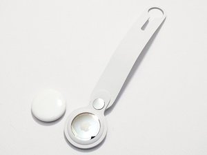 AirTagも実機の画像をご紹介しよう。サイズは500円玉よりもひとまわり大きいが、質量が11gととても軽い。ステンレススチールの本体側にアップルのロゴが刻まれている。