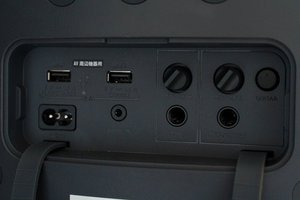 入力端子はステレオミニ1基/マイク・ギター1基、USBポート2基を搭載。BluetoothコーデックはLDAC/AAC/SBCをサポート。連続再生時間は最長約30時間(MEGA BASSモードオン時)、外形寸法は460W×256H×215Dmm、質量は約5.6kg。
