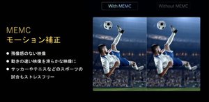また、「MEMCモーション補正」では、動きが激しい映像であってもスムーズな映像を出力するということで、サッカーやテニスなどスポーツの試合もストレスなく視聴できるとしている。
