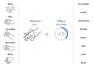 エフェクトはピッチベンド/ディストーション/ディレイなど8種類が用意されており、これを手首を回す/手を上げ下げする/横に振るなどのモーションと組み合わせることが可能。設定などは専用のiOSアプリから行い、楽器と接続したオーディオインターフェイスにアプリを起動したスマホをUSB接続することで、出力信号にエフェクトをかけることができる。