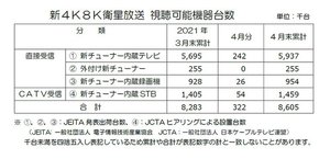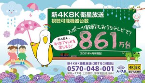 放送サービス高度化推進協会(A-PAB)は、2021年4月までの新4K8K衛星放送視聴可能機器台数の集計値を発表。4月単月では32万2,000台を出荷/設置し、前年同月比約5割増という大きな伸び率を見せ、累計では約861万台を突破したという。