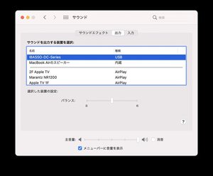 さて、ハイレゾロスレスやロスレス楽曲を再生するには、再生ボタンを押すだけでよいのだが、ハイレゾロスレスの場合は、USB-DACなどの外部機器が必要になる。さらにmacOSの「設定」から、その外部機器を選択し、サウンドをそちらから出力するように選択しなければならない。