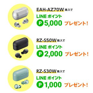 キャンペーンの対象機種はテクニクス「EAH-AZ70W」、パナソニック「RZ-S50W」「RZ-S30W」の3モデル。また、プレゼントされるLINEポイントは機種によって異なっており、EAH-AZ70Wでは5000ポイント、RZ-S50Wでは2,000ポイント、RZ-S30Wでは1,000ポイントがそれぞれもらえる。なお、キャンペーンの応募は1人1回(1台)限りとなる。