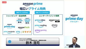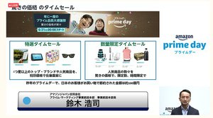記者発表では冒頭に、アマゾンジャパン合同会社プライム・マーケティング事業統括本部 事業統括本部長の鈴木浩司氏が挨拶に登壇。プライムデーの取り組みについて説明した。