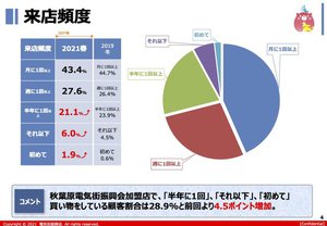 蔓延防止措置や緊急事態宣言発出による期間別に、来訪者の年代別、都道府県別、キッカケといった要素を比較すると、「そう大きな変化はない」。来店頻度を見ると「以前から秋葉原に週に1度以上来られている常連客の方々の来店頻度にそう大きな変化はなく、月に1度、半年に1度の来店の方々は微減」。来店の目的を見ると、コロナ禍以前よりも家電の買い物をする方々が増えているという。