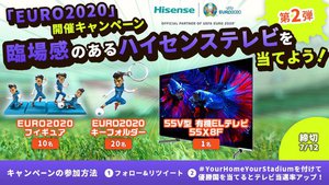 6月11日〜6月30日に実施した開催記念キャンペーンに続く第2弾。第1弾と同様、ハイセンスジャパン公式Twitterアカウント(@hisense_japan)をフォローの上、該当ツイートをリツイートすることで応募となる。応募者の中から抽選で1名に55型4K有機ELテレビ「55X8F」が、10名にEURO 2020オリジナルフィギュアが、20名にEURO 2020オリジナルキーホルダーがプレゼントされる。
