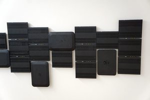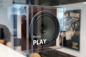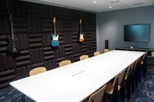 また、会議室は、映像配信サービス「ひかりTV」にちなんでリビングシアターを模した「Room SHOW」、音楽配信「ひかりTVミュージック」にちなんでギターや吸音材を配置した「Room PLAY」といった具合に、同社が展開する各種サービスに由来する演出に。加えて、オフィスルームにある打ち合わせスペースには「ひかりTV」の歴代チューナーがまるでインテリアパネルのように貼り付けられたりしている。