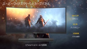 Mate View GTは、34インチのワイドカーブVA液晶ディスプレイを搭載。アスペクト比21:9のパノラマビューと、曲率1,500Rのスーパーワイドスクリーンにて、没入感を高めた大迫力な映像を映し出せるとのこと。